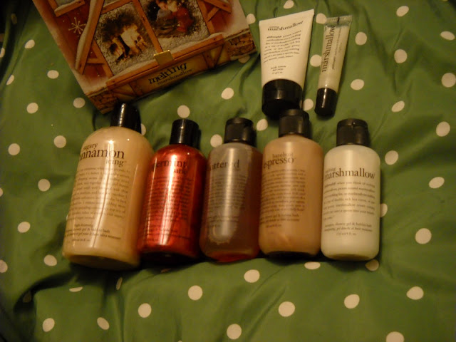 You may recall that I'm a little in love with Philosophy's line of foodie-friendly shampoo/body wash/bubble bath. Since the brand rarely has sales, and the large bottles normally cost $16, I usually have to make my June birthday treats/gifts last until Christmas...and the Christmas suds have to last until my birthday. Well, thanks to Sephora's Christmas in July Philosophy sale (you still have a few days!), I got to rack up a bit. All the fragrances were from the Christmas line, which usually has the yummiest "flavors" anyway.