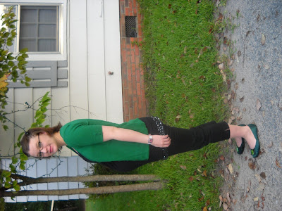 Anyway, here's that gorgeous maternity tank top again. The sequins picked up the green in the rest of the outfit. I want to wear that tank as much as possible. I think it will look like a completely different top with various colors. The black capris are probably my favorite maternity pants (besides the comfy gray leggings). I adore this cardigan. Mom and I each bought one at the same time. I love the buttons on the sleeves, and the emerald shade is wondrous. Green became one of my favorite colors (along with purple) a year or two ago.