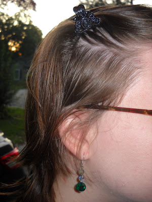Anyway, here's that gorgeous maternity tank top again. The sequins picked up the green in the rest of the outfit. I want to wear that tank as much as possible. I think it will look like a completely different top with various colors. The black capris are probably my favorite maternity pants (besides the comfy gray leggings). I adore this cardigan. Mom and I each bought one at the same time. I love the buttons on the sleeves, and the emerald shade is wondrous. Green became one of my favorite colors (along with purple) a year or two ago.