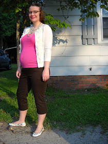 The audio books will sweeten the return to work. I'll also enjoy getting dressed and putting on makeup everyday, especially since my belly mandates extra creativity. I never thought I'd care about clothes! But, like makeup, they've become another form of self-expression. My students have said, "I wish I looked as cute as you when I was pregnant!" Students can be very sweet, and I'm always amazed at how much they notice. My spring students began to think I was pregnant when I was about ten weeks along, and a couple were brave enough to nervously ask a couple of weeks after that. "Your stomach didn't look like that when the semester started...."