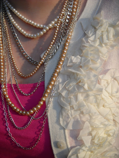 I love the layers of this necklace even though I have to be careful to avoid serious tangling. The two short white pearl strands were originally one long strand which broke the first time I wore the necklace (I leaned down to get something out of my work bag, and the strand caught on the arm of my chair...pearls everywhere). I restrung them as two strands on elastic thread.