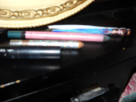 This is a spread of my favorite makeup on my foundation-spattered desk-turned-vanity. After my big, black vinyl Sephora makeup bag died a moldy death in the great sink flood of 2007, I thought I'd never find another awesome makeup bag. But I just love this sparkly silver, black, and pink VH-1 Save the Music bag. It's the perfect size for holding most of my favorites, bringing on trips, and fitting into one of the desk/vanity's cubbies. Posts like this make me wish I were a better photographer with a better camera, but oh well.