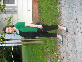 Anyway, here's that gorgeous maternity tank top again. The sequins picked up the green in the rest of the outfit. I want to wear that tank as much as possible. I think it will look like a completely different top with various colors. The black capris are probably my favorite maternity pants (besides the comfy gray leggings). I adore this cardigan. Mom and I each bought one at the same time. I love the buttons on the sleeves, and the emerald shade is wondrous. Green became one of my favorite colors (along with purple) a year or two ago.
