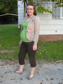 This is the second jacket I bought. It's a great color--tan? blush? I got compliments on this outfit. I think it's funny that people are rather shocked when a pregnant woman looks nice. I think my job requires the effort, and if I'm leaving the house, I'd like to feel good about the way I look. On this day, just about everyone at work was wearing brown or green.