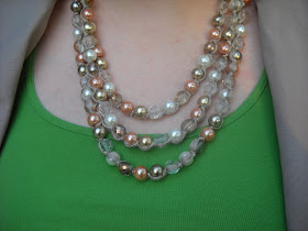 This was the first fancy necklace I bought as an adjunct instructor, and I was very proud of it. The colors are neutral enough to work with just about anything, and the necklace dresses up a simple top. I like how the ribbon threads through each bead.