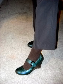 Green is hard to find. But yes, I found green...in that same shirt (which at this point I'd worn, in various colors, for three days in a row)! This outfit was comfortable but felt very grown-up. The green Mary Janes are one of my favorite pairs of shoes, and they have the dressiness of heels but are comfortable enough for my long days.